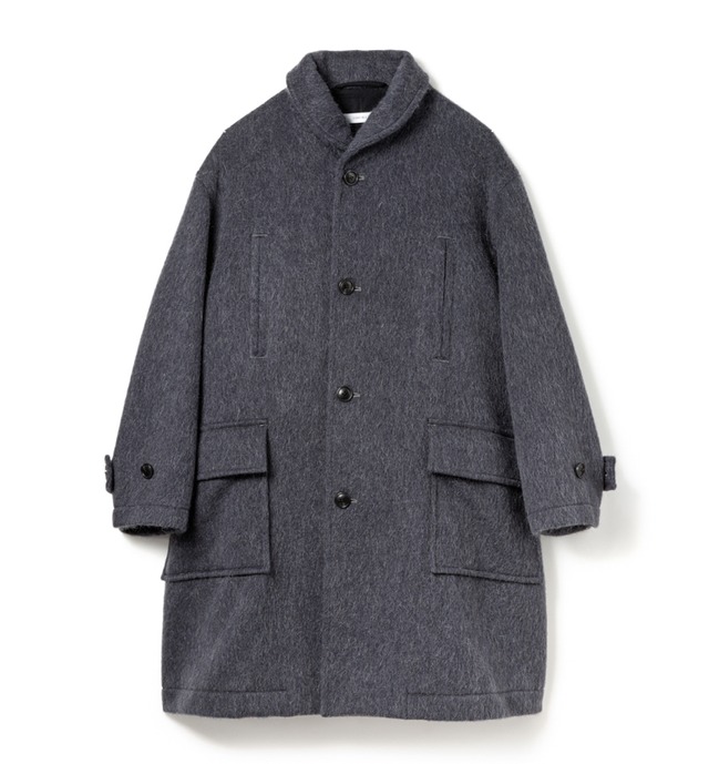 上質なキッドモヘヤブレンドのシャギーウール生地を使用した、ゆったりシルエットのショールカラーコートです。 キッドモヘヤは収穫量が極めて少なく、ハイグレードな原料として重宝されています。 細くて柔らかく、ふわふわしたタッチと暖かさを生かしたシャギーが特徴の素材です。 袖裏地のキュプラ (ベンベルグ)は繊維自身が水分を含む (公定水分率11%)、呼吸する繊維です。 湿・放湿性にも優れ、静電気も起きにくい裏地に最適な素材です。 ● 表地:Wool 70%, Mohair 10%, Nylon 20% / 身頃裏地:Cotton 100% / 袖裏地:Cupro 100% ● 内ポケットあり(シームポケット仕様)あり ● レザー力釦を使用 size:M Length(着丈)99cm / Sleeve(袖丈)58cm / Shoulder(肩幅)55.5cm / Chest(胸囲)143.5cm collar:CHARCOAL 品番:60425WA05-OW SANDINISTA / サンディ二スタ / コート