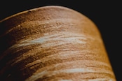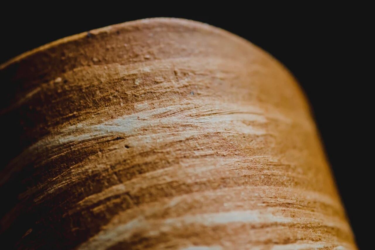 容器の淡い黄赤と白い刷毛塗は、晩秋の世界とその中に吹く風を表現しています。
