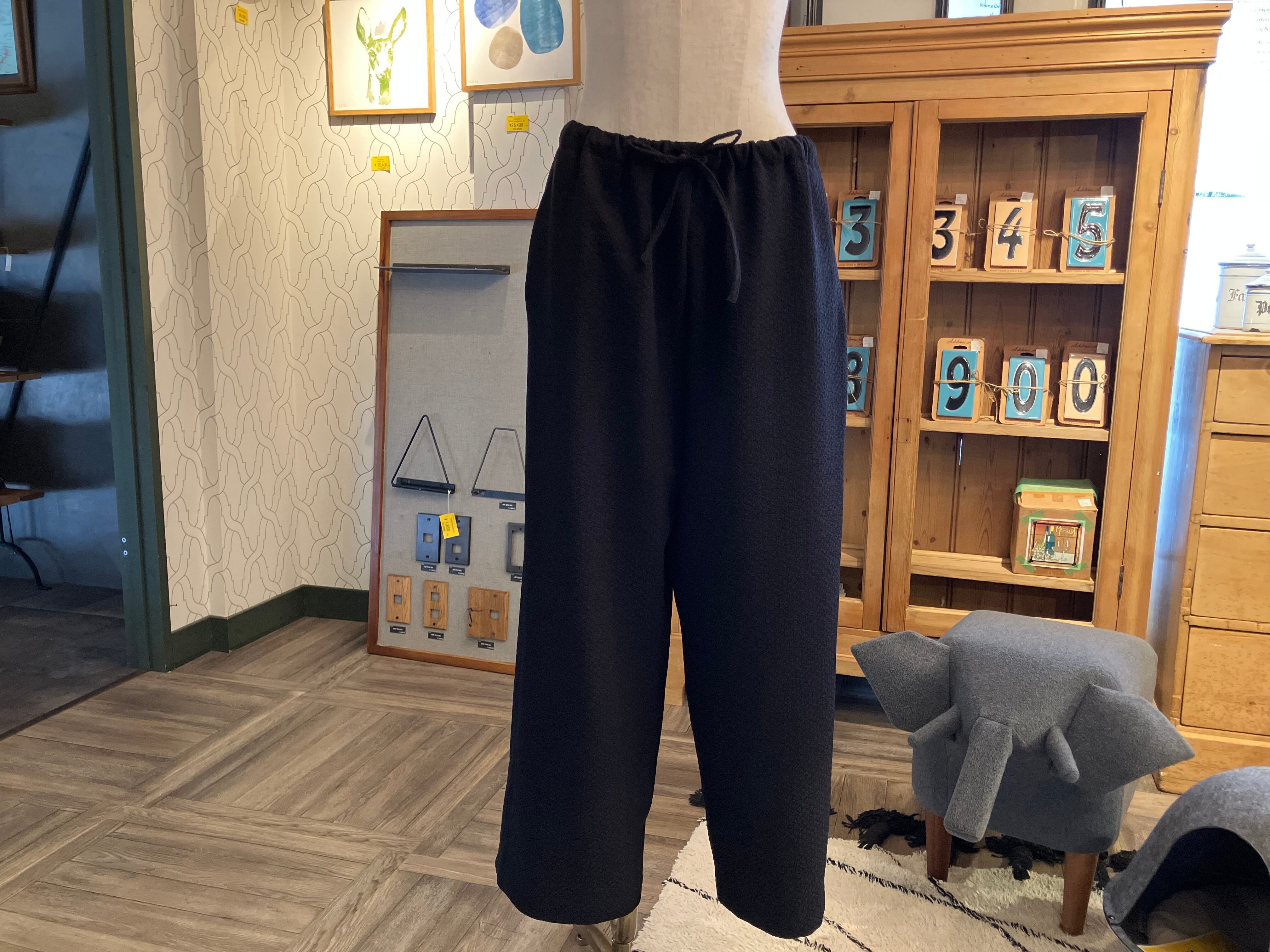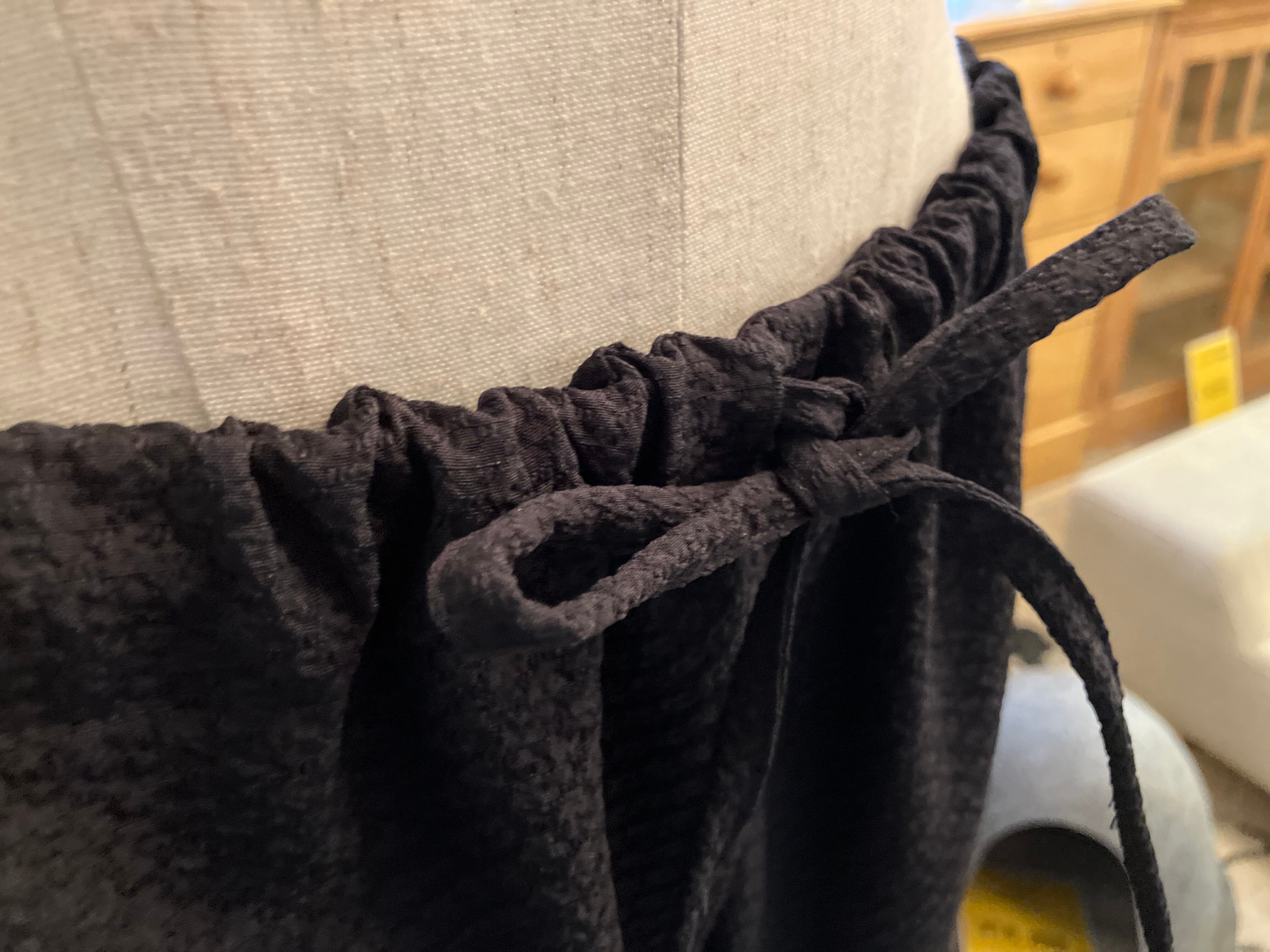 ウェストは紐入りで調整でき、生地はポリエステル混で程良くストレッチ性もあります。