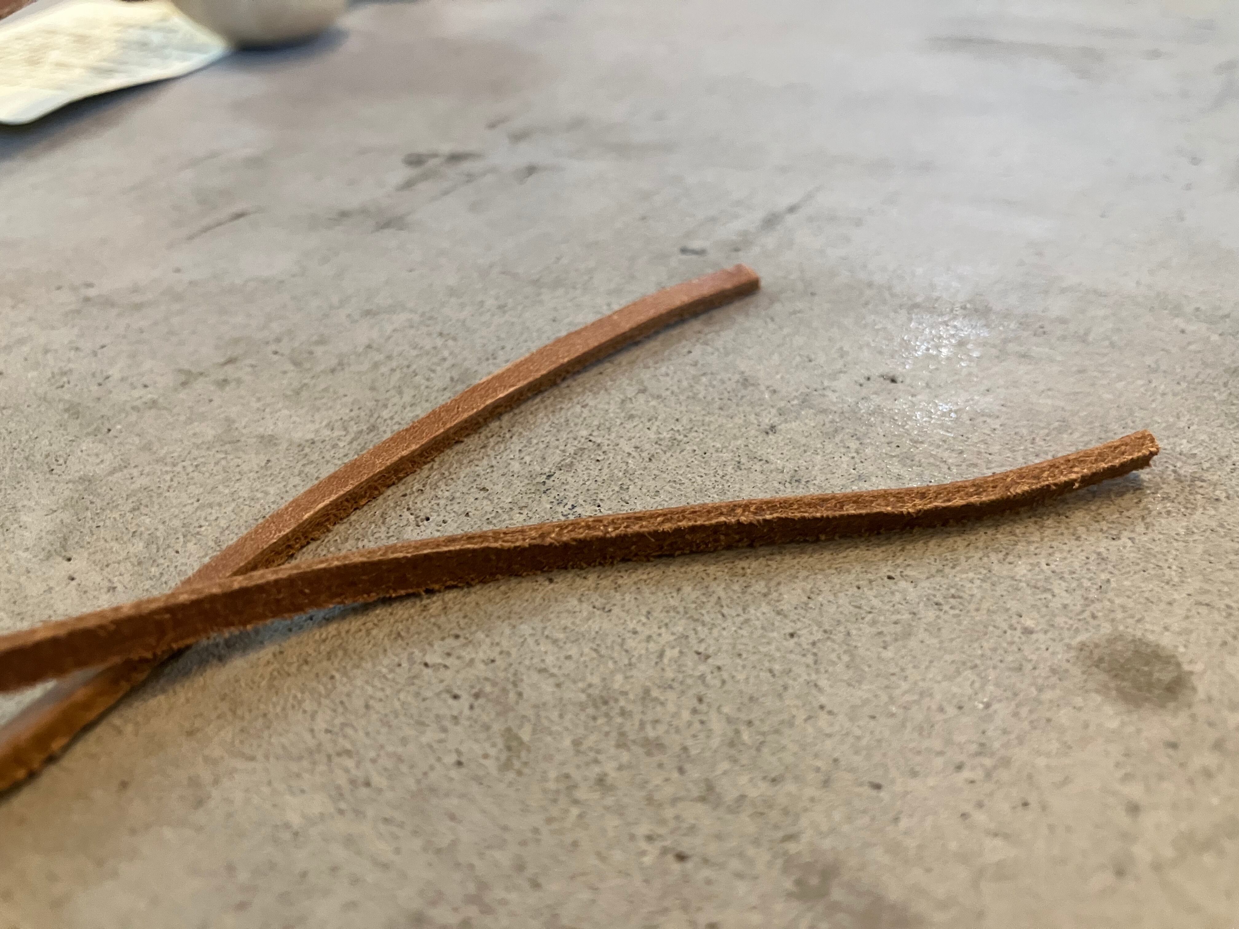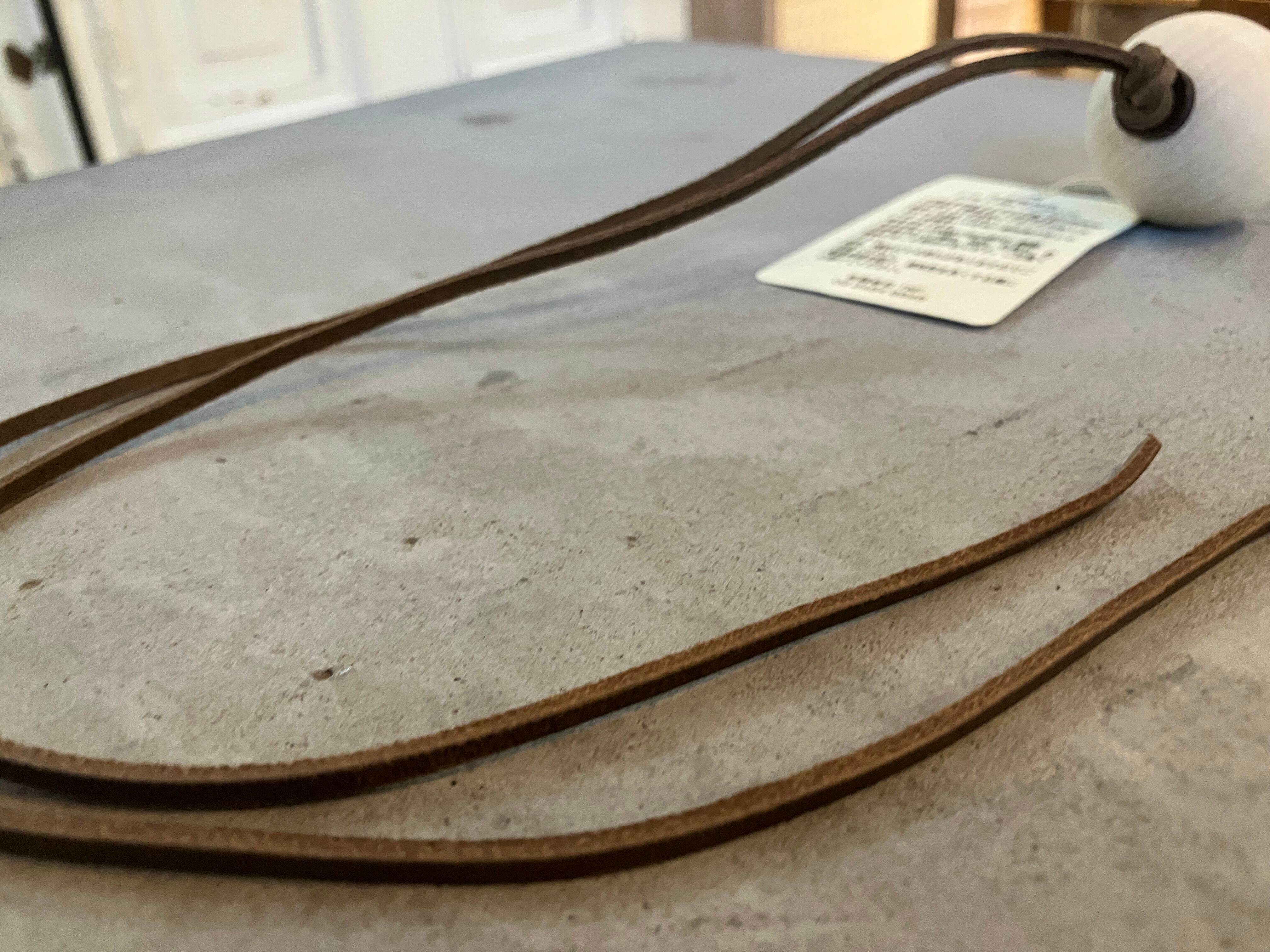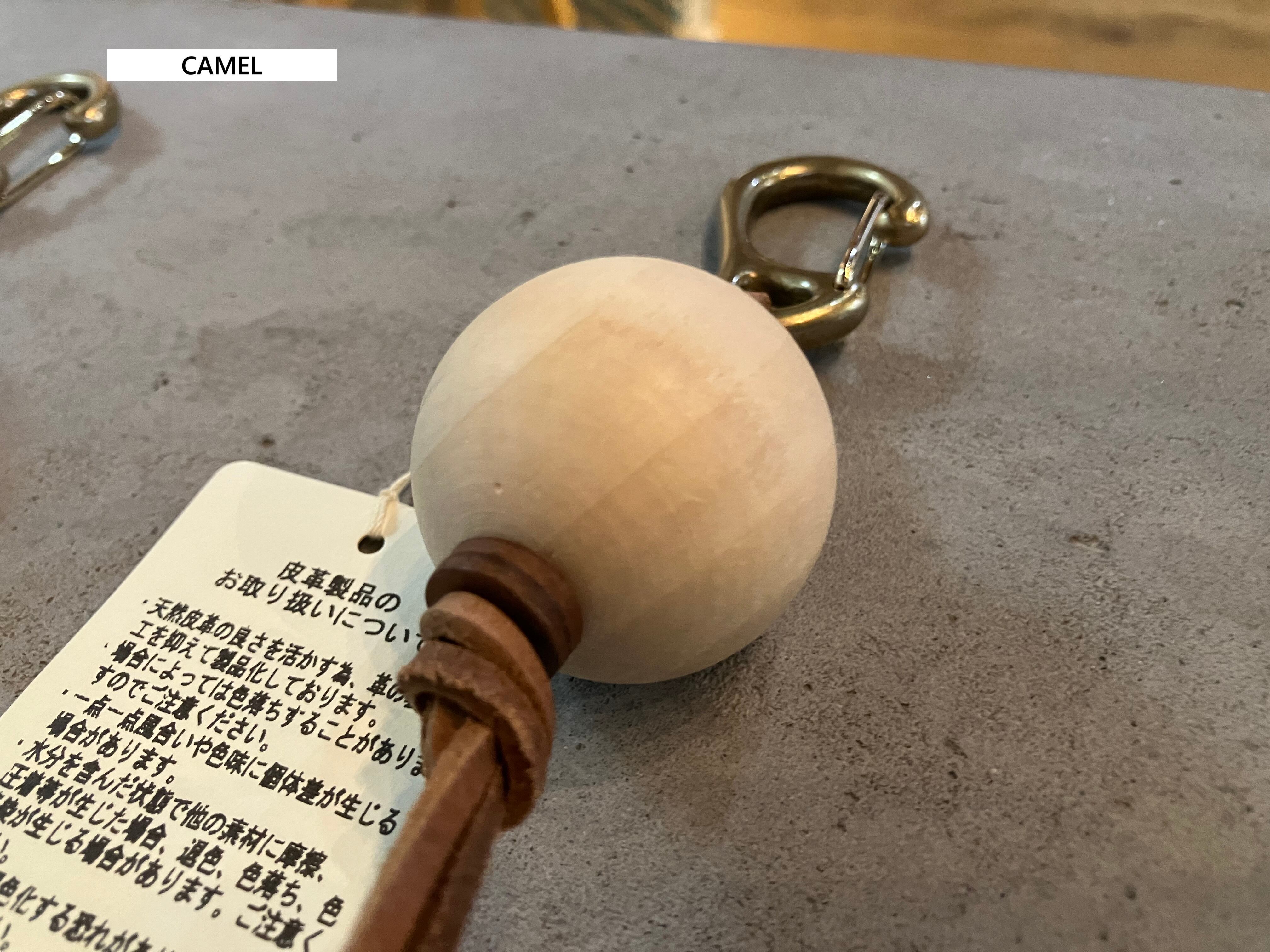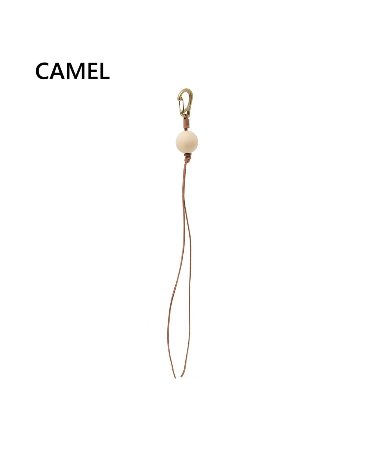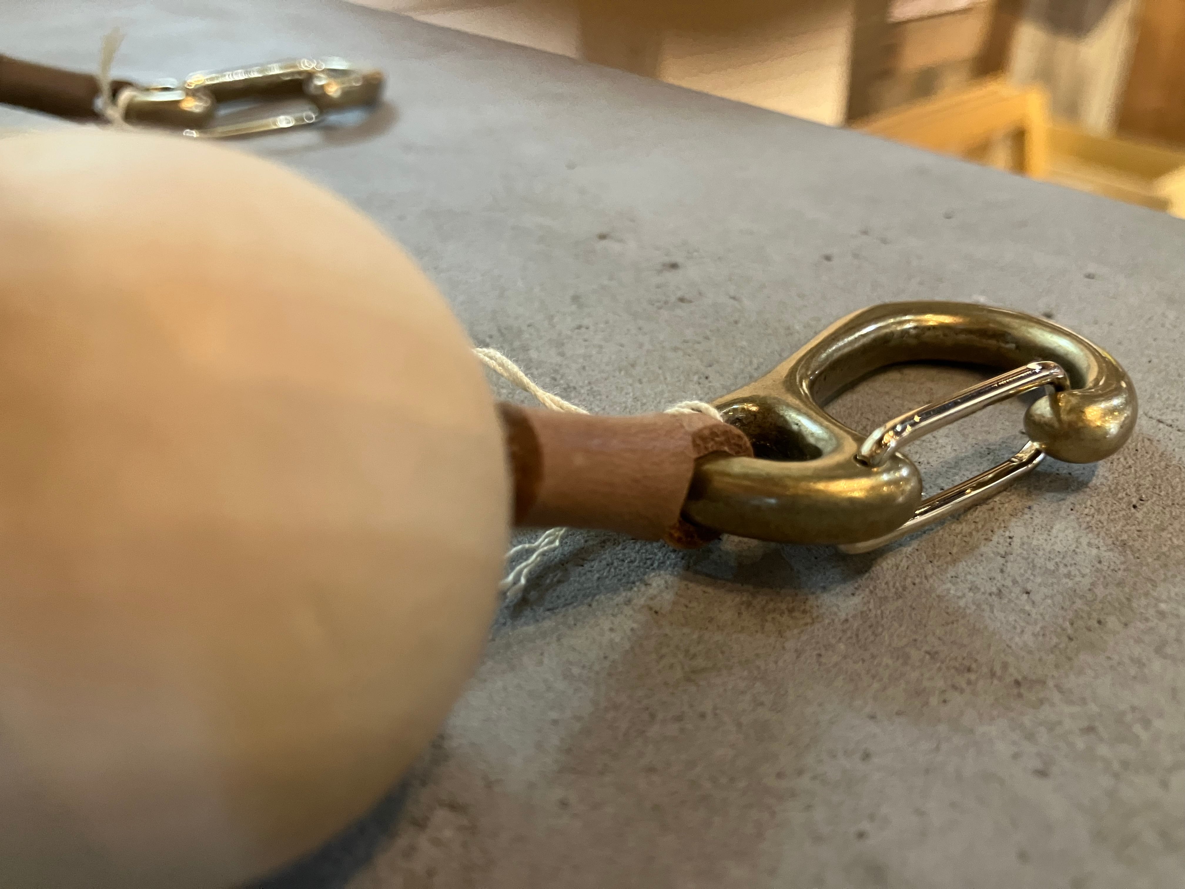 丸みを帯びた真鍮製のカラビナを使用し、長めの革紐はカットすることで自由にアレンジが可能です。家具の生産工程で出る端材を使用しています。