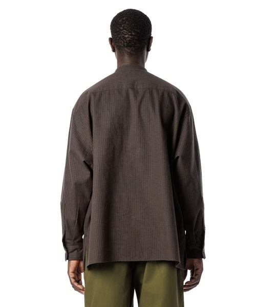 16番手のネルチェック生地を使用した、通常より大きめシルエットのバンドカラーシャツです。生地の特徴は太番手糸を使用し最終仕上げで起毛加工を施してますので、しっかりとした手触りがあるのが特徴です。