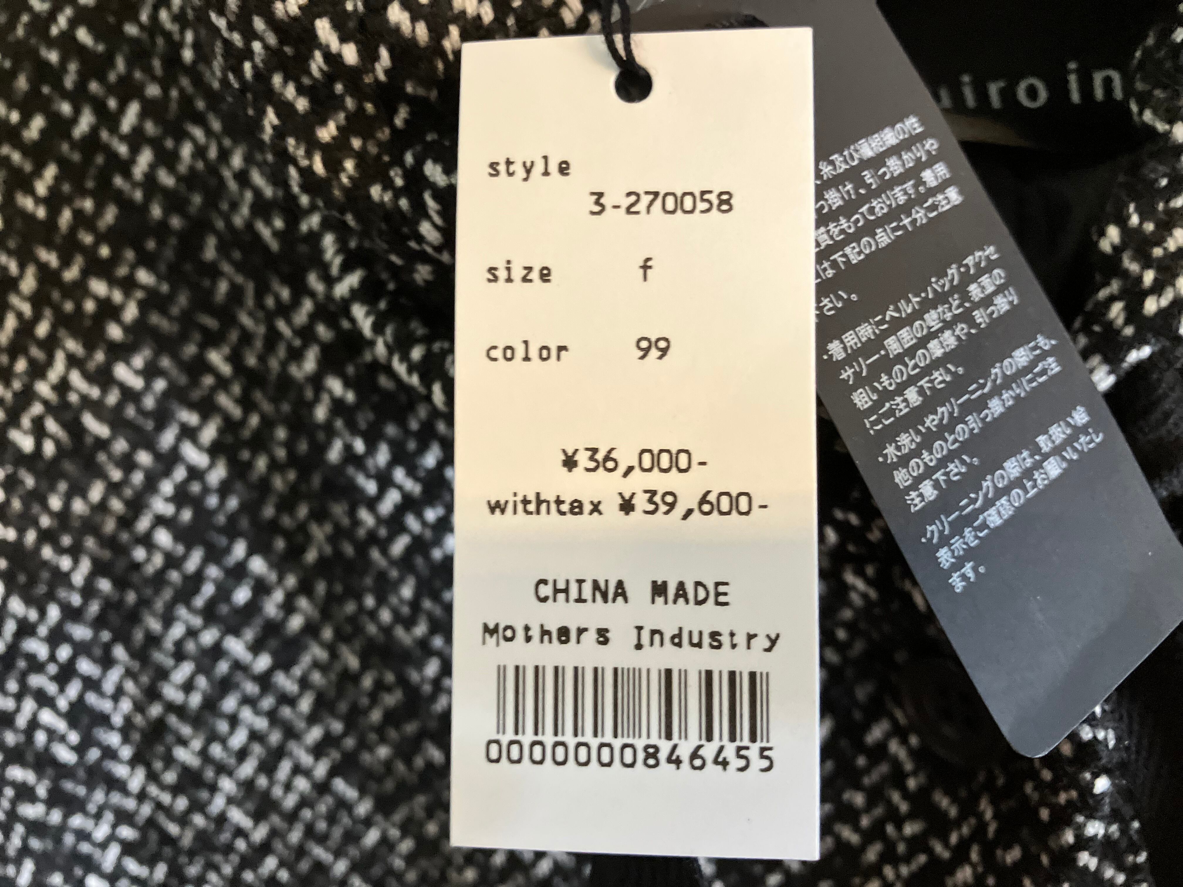 (本体)ポリエステル49%ウール39% アクリル7%ナイロン3% レーヨン2%(別布部分)ポリエステル80%コットン20%(裏地)ポリエステル100%
