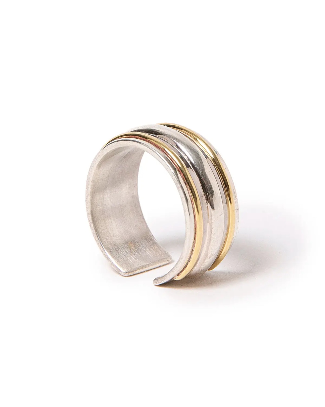 土台にくぼみを作りブラス、シルバー、ブラスと異素材でストレートなラインを表現したコンビネーションリングです。