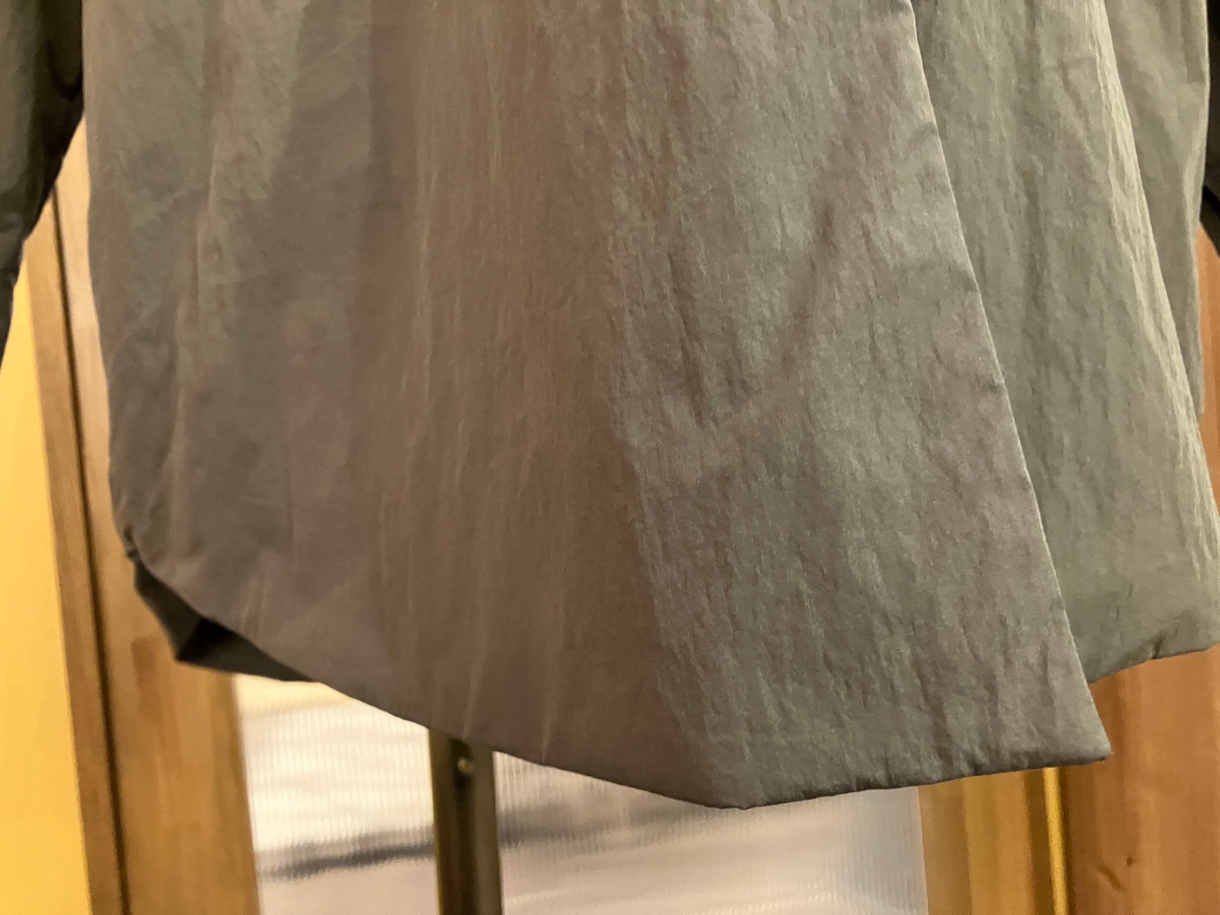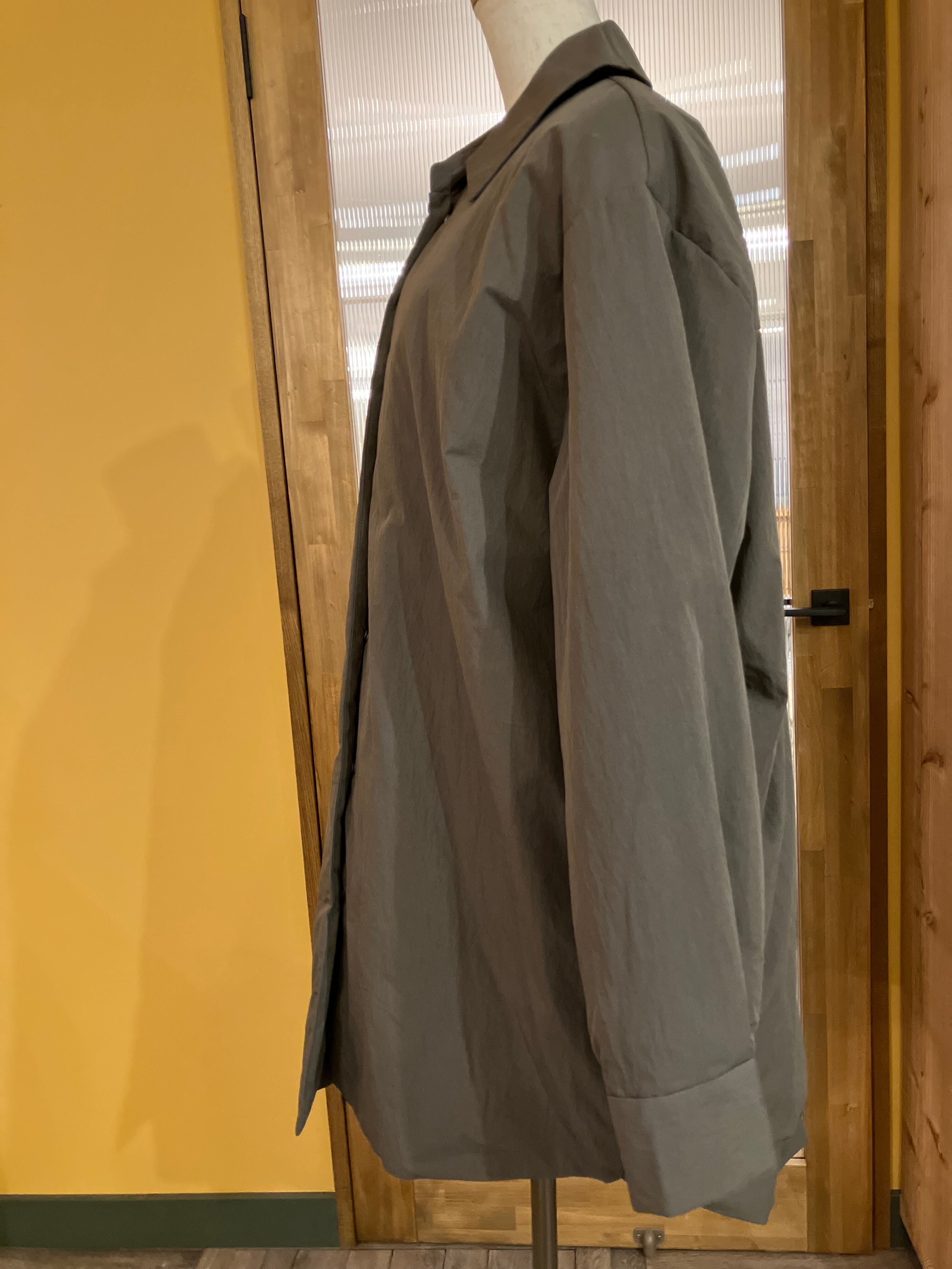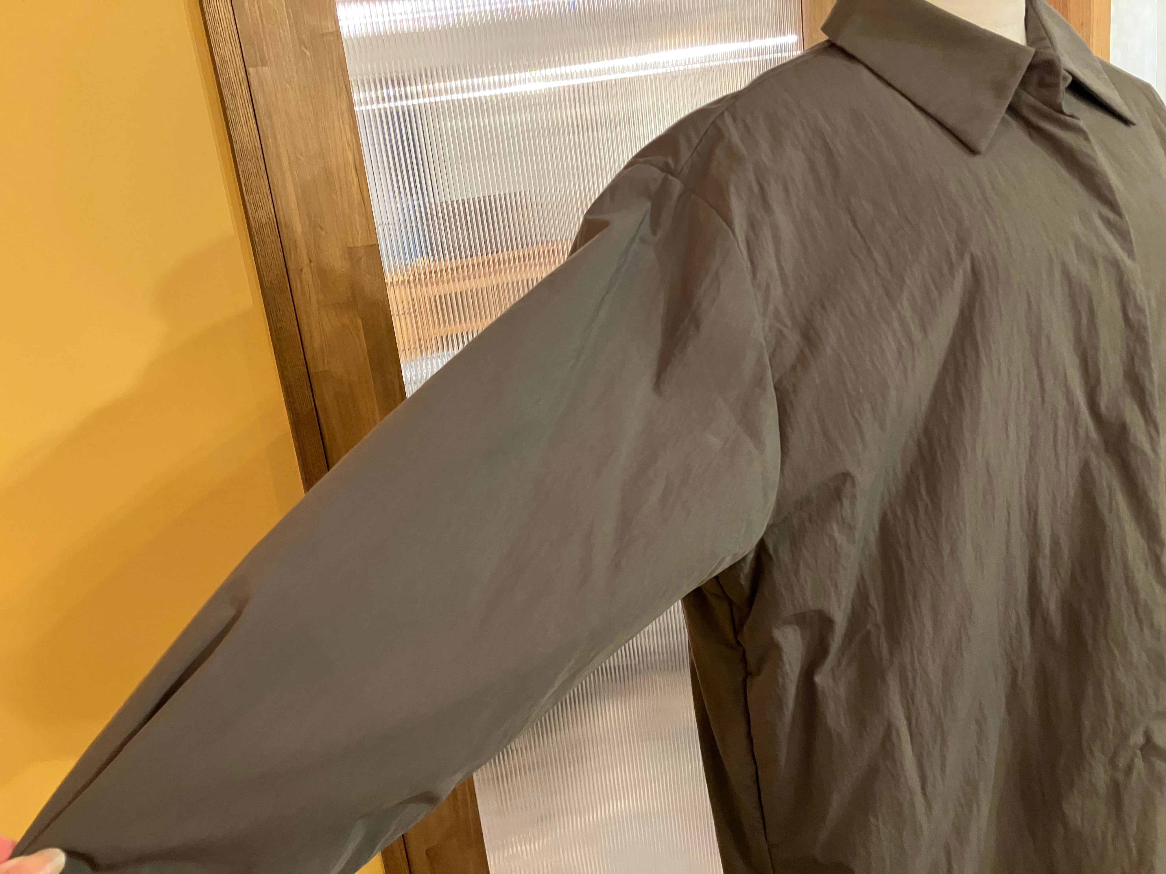 mizuiro indのシャツのシルエットにそのままダウンを入れてシルエットを活かし、大変軽さのあるアウターを表現しました。裾は前後差を付け長すぎない丈感に仕上げています。