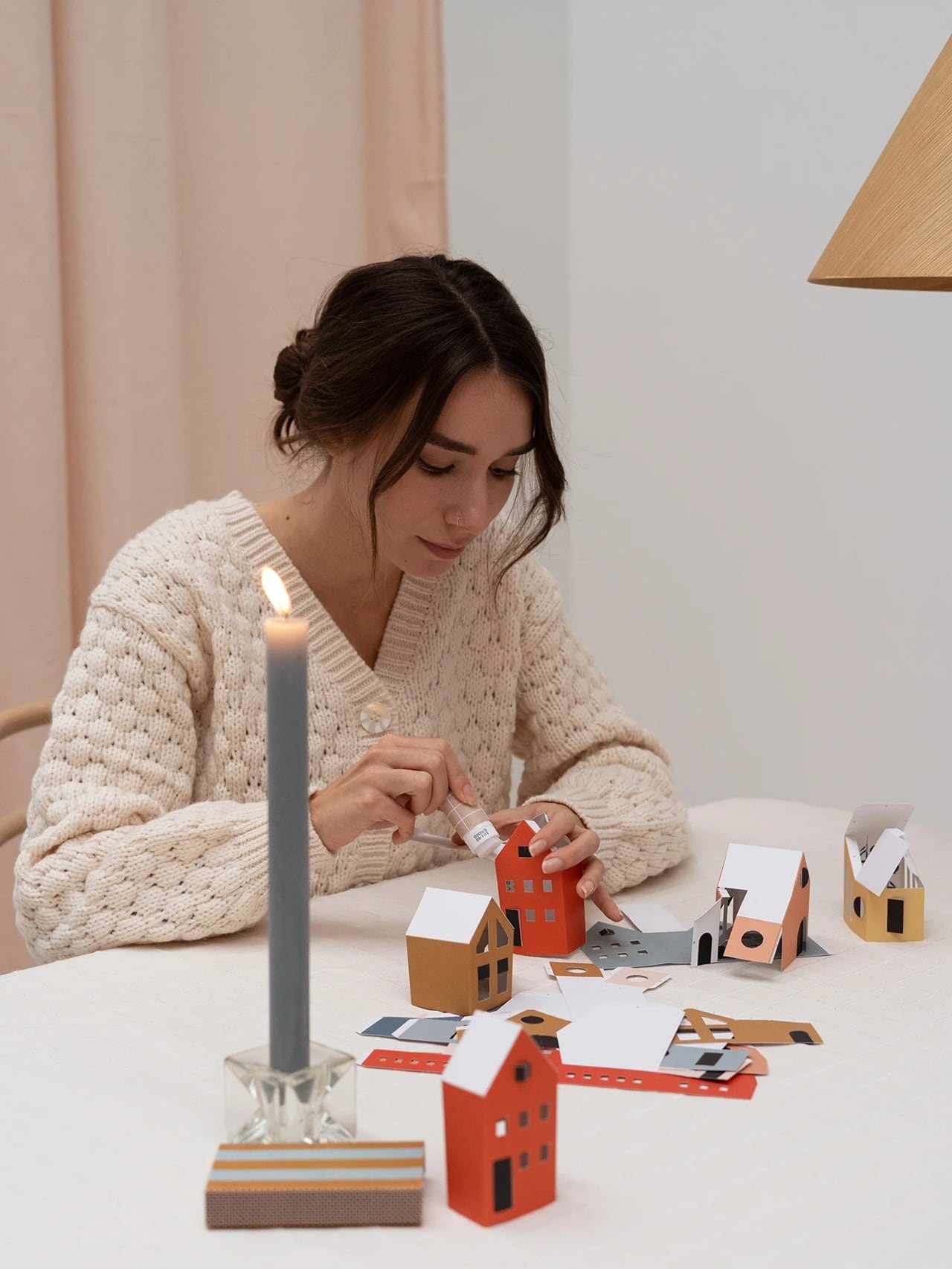 • ペーパークラフトセット:12軒の家。あらかじめ穴あけと折り目が付けられており、切る必要はありません。