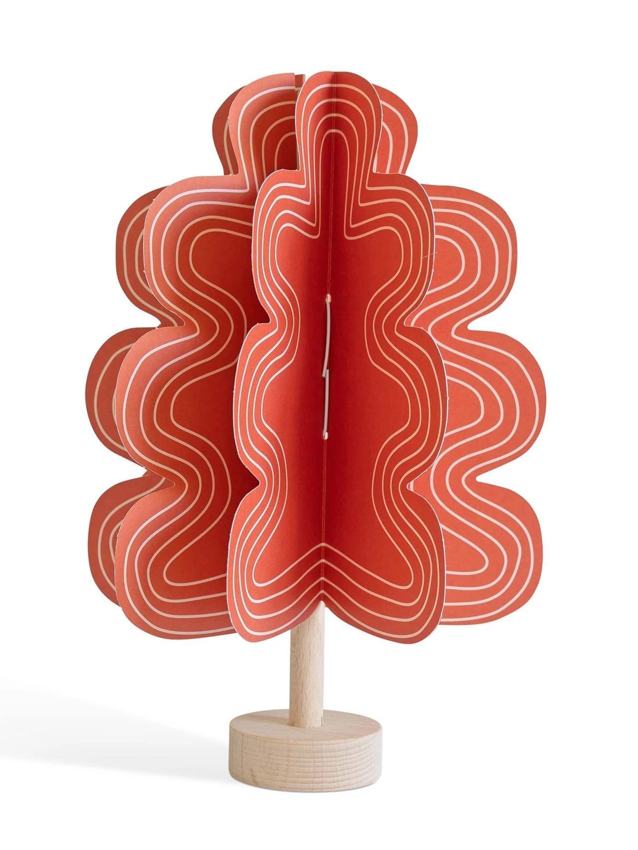 赤いオーク材に、白のグラフィックな直線的なデザインが映えるこのツリーは、ミニマルでナチュラルなインテリアの素敵なアクセントになります。