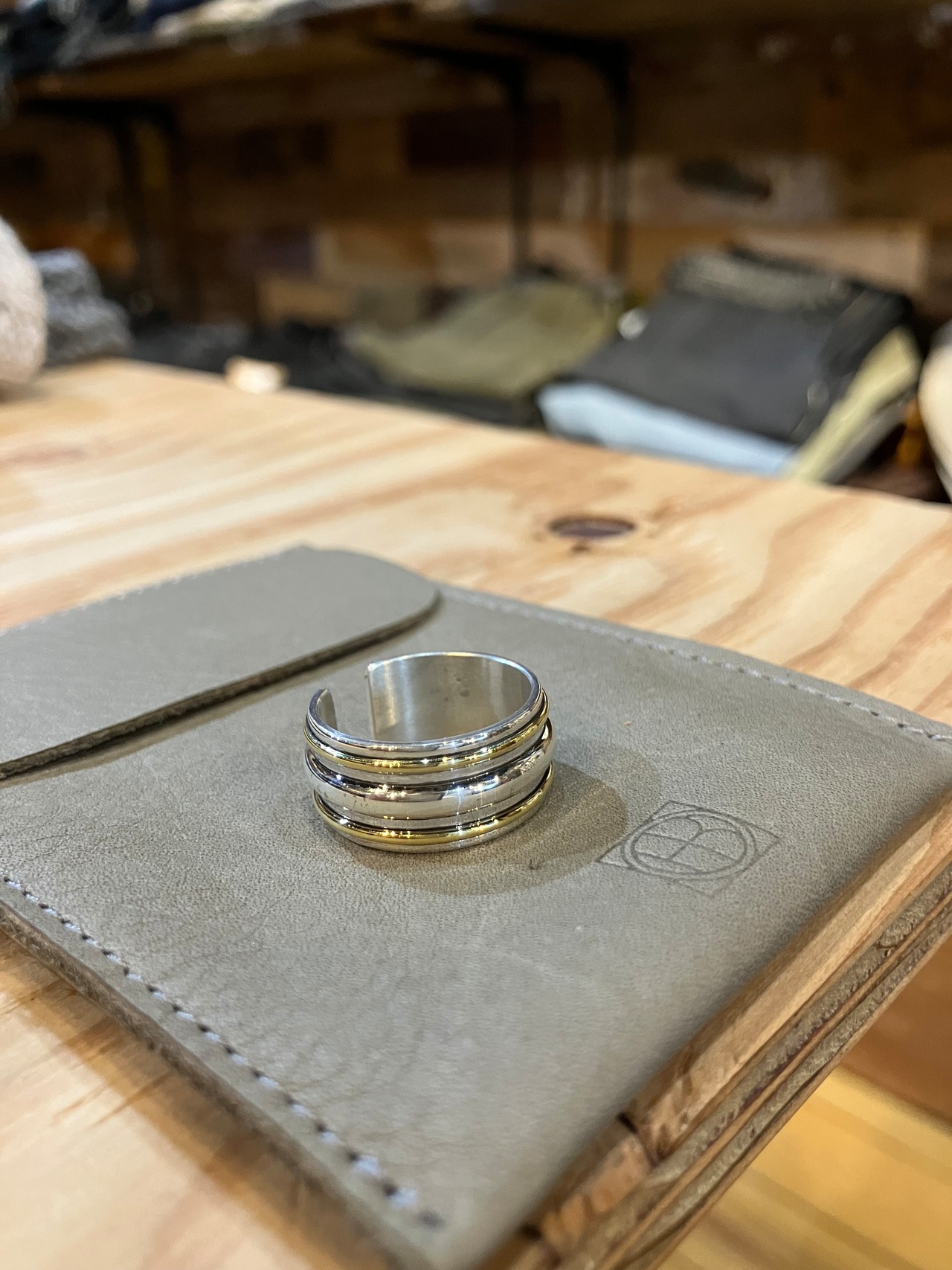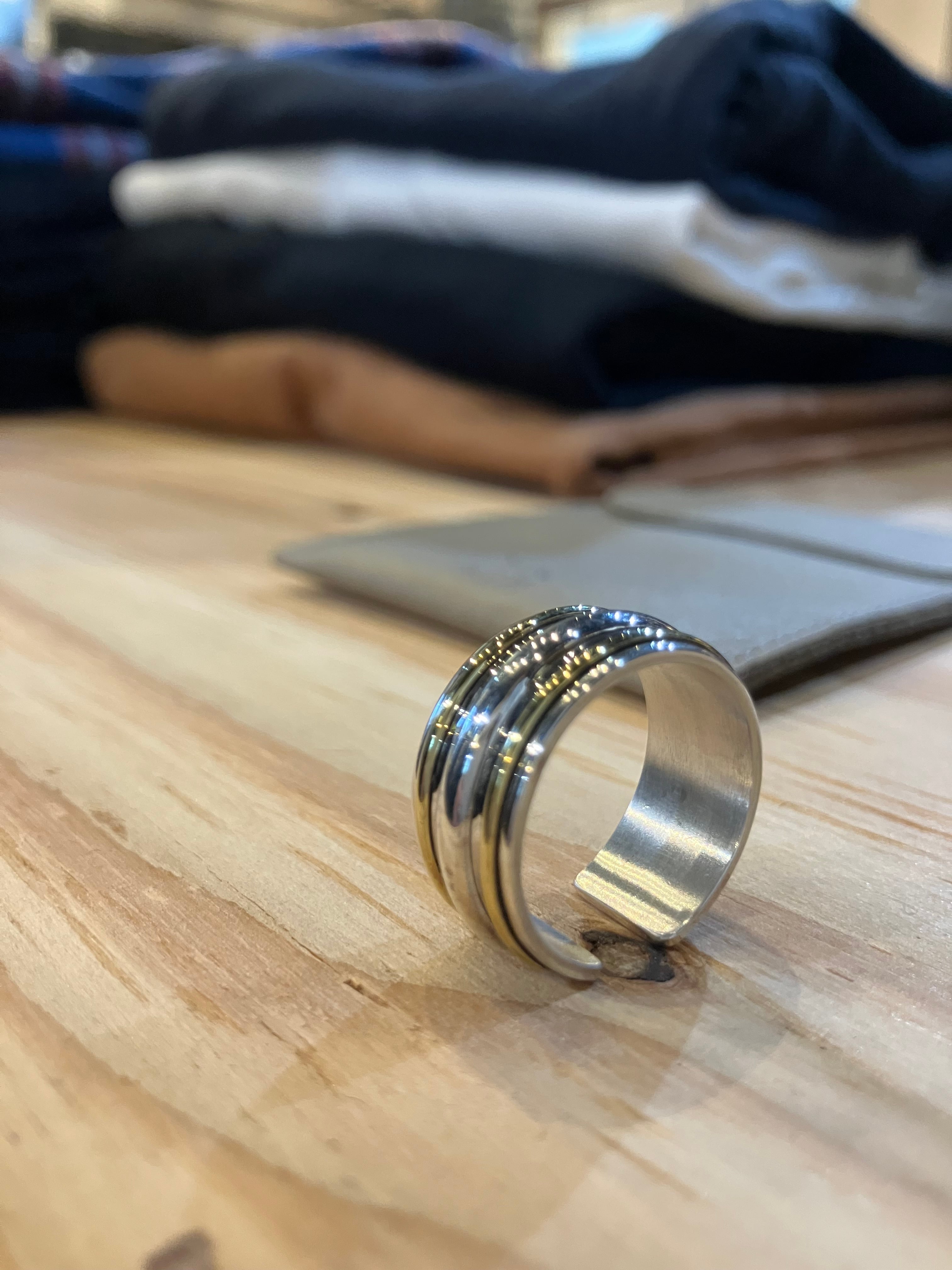 土台にくぼみを作りブラス、シルバー、ブラスと異素材でストレートなラインを表現したコンビネーションリングです。