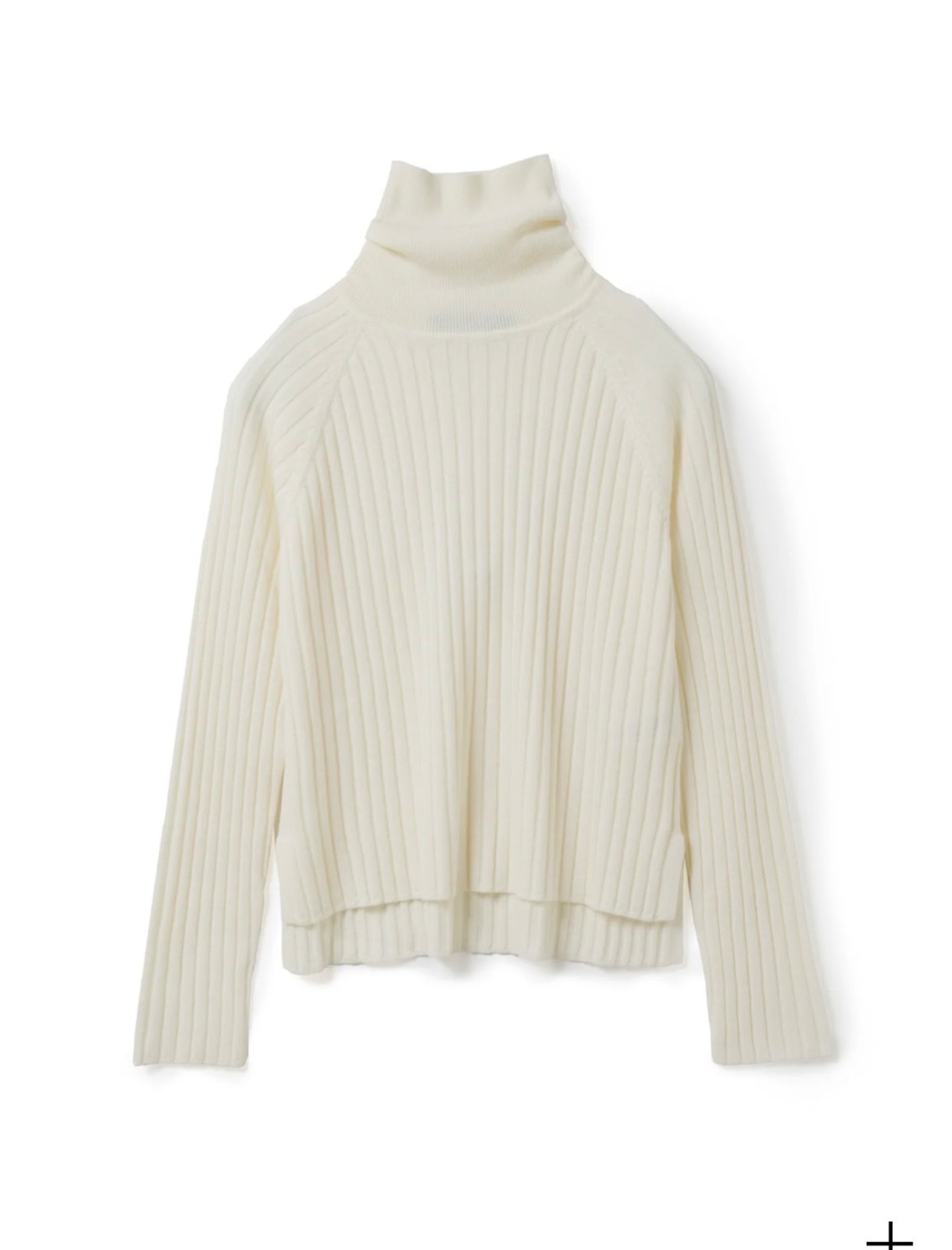 リブが印象的な、冬から春にかけて長く着られるハイネックニット。