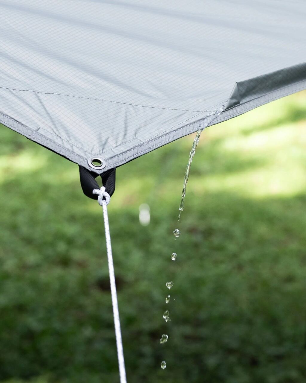 フチには雨どいが付いているので、コーナー部分から雨をスムーズに排出できます。左右非対称の形状により、テントに連結させた設営に適しています。