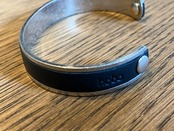 凹字型のブラス製プレートの溝を埋める形でヴィンテージ加工を施したカウレザーをあしらった、コンビ素材のブレスレットです。